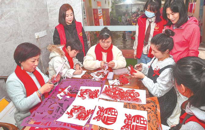21日,由福州市文联、鼓楼区委宣传部和统战部主办的“喜迎龙年‘创福传福送福’民间文艺进社区——2024年原创福文化作品进南街街道小柳、柳河社区”系列活动,在福州市鼓楼区福文化站点集中启动。图为福州剪纸非遗传承人带领学生们在现场剪纸。福建日报记者 吴鹏 摄