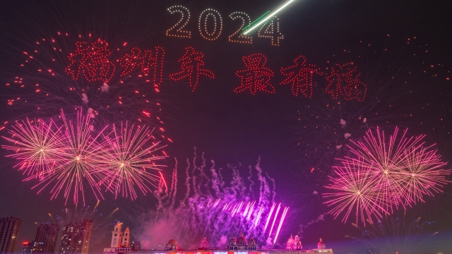 福州用一场盛大的大型烟花无人机光影秀,向大家道一声新春快乐!(福州日报社记者组摄)