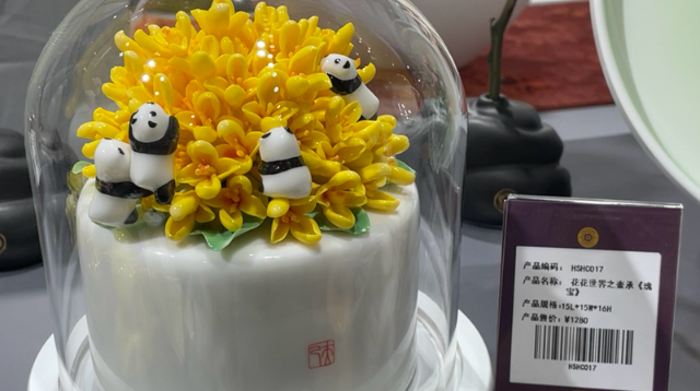 作品《百卉争妍》 现场作品《瑰宝》是一个壶承,可用作夜灯,其中融入了桂花与熊猫的元素,实用与美观兼具。另有现场作品《百卉争妍》令人驻足观望。公司成员介绍,该作品制作历时四十余天,在团队制作过程中,不仅要把控作品整体的平衡,还要考虑陶土的保湿,否则作品容易干裂、坍塌。