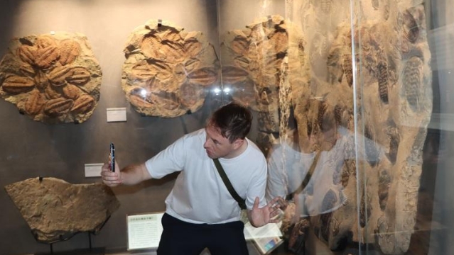 英国的自媒体博主托比拿着手机拍摄。 东南网5月17日报道(记者 卢金福)“眼前这个三叶虫化石,是好几亿年前形成的,依然保存得很好,能清晰地看到三叶虫的形态,太不可思议了。”今日上午,在南安市水头镇的福建省英良石材自然历史博物馆里,来自英国的自媒体博主托比拿着手机拍摄视频,对着镜头用英文兴奋地讲述着这里的“石头”故事。当天,“中国有约·相约福建”2024年国际媒体采访活动来到了“世界石都”南安,开启寻“石”之旅,探访南安石材产业转型升级之路。 穿越“石”空 走进绚丽多姿的石头世界 福建省英良石材自然历史博物馆馆藏标本数万件,全馆紧扣岩石主题,通过科学研究和社会教育,发现诠释并传播自然界中有关岩石的故事与知识。内设自然馆、人类馆、石材艺术馆、石材产业馆四个常设展馆,以及化石矿物清修实验室、博物馆文创中心和全球石材资源中心,是国家4A级旅游景区。