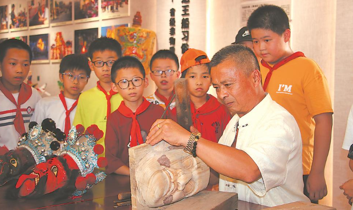 林庆元(前右)用香樟木雕刻傩面具模具。詹海伟 摄 东南网6月27日报道(福建日报记者 陈盛钟 通讯员 廖娴娴) 非遗木雕、纸扎王船、傩面具涂鸦……24日,一场以“走进傩文化,探寻家乡美”为主题的傩文化研学活动,在莆田市城厢区灵川镇东进村举行,35名小学生走进该村非遗民俗文化展览馆和非遗传习所,近距离感受傩文化的风采。 东进村古称东汾,是一个有着上千年历史的古村。村里的东汾五帝庙始建于唐代,拥有包括国家二级文物唐代石狮在内的65件文物。东进村非遗民俗文化展览馆于去年10月对外开放,占地面积约300平方米,分为闽台送王船习俗、黄濂起义歌、皂隶舞等10个单元。 当天,展览馆变身非遗传承小课堂,村党员志愿者詹海伟为学生详细介绍了闽台送王船习俗的王船制作、历史典故及传说故事,以及莆田市级非遗项目——长篇俚歌《黄濂起义歌》的人物故事等内容,并为大家演奏梆鼓咚乐器。他的讲解绘声绘色、引人入胜,让孩子们进一步感受传统文化魅力、了解家乡历史。 莆田市级非遗项目东汾皂隶舞传承至今已有600多年历史,它的面具表情狰狞、妆饰奇特,舞蹈动作粗犷,保留着上古时期“嫫母”傩面具、汉唐傩舞姿和明代皂隶装束等元素特征。研学活动期间,非遗传承人、皂隶舞面具制作工匠林庆元介绍了皂隶傩面具的起源和制作过程,并现场讲解和演示香樟木皂隶面具模具雕刻技艺。 今年59岁的林庆元出生于当地一个傩面具雕刻技艺世家,20岁起便追随父亲林玉坤学习傩面具雕刻技艺。这些年来,他一把雕刀不离手,坚守着傩面具制作技艺。 “傩面具是傩文化的重要组成部分,用于傩仪、傩舞和傩戏,表现皂隶的人物性格特征。”林庆元说,皂隶傩面具制作工序复杂,首先是用香樟木雕刻出面具模具,再用脱模纸、麻布、桐油灰等材料一层层重复裱糊,再经过打磨、绘图、上光油、安装胡须眉毛、制作头冠头饰等工序才制作而成。 最具挑战性的,是对神形的塑造。“在雕刻面具模具时,要运用浮雕、透雕、圆雕等综合技巧,雕刻出傩面具生动的形象。”林庆元说。出自他手的傩面具,个个栩栩如生、惟妙惟肖。 在林庆元的带领下,孩子们走进东进村党群服务中心非遗传习所,通过DIY手绘傩面具,在交流互动中激发灵感,从非遗文化里挖掘趣味。 “老师,这个颜色画在这里好看吗……”一片欢声笑语中,一个个充满童趣的傩面具呈现在大家眼前,孩子们兴奋地展示着自己的作品,并将面具戴在脸上,扮演着自己喜欢的角色。 “非遗文化是中华民族生生不息的根脉。”东进小学校长吕勇椿表示,此次傩文化研学之旅让学生加深了对当地优秀传统文化的了解和热爱,激发他们积极传承的文化自信和责任担当。 |