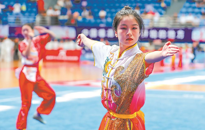 20日,福建省首届八闽武术大赛在福清市体育馆开幕。来自全省92个武术团队的1600多名运动员参赛。本次比赛由福建省武术协会、福州市体育总会主办,分为拳术系列、器械系列、对练系列、集体系列。其中,青少年运动员参加的国家级非遗项目地术拳和咏春拳,省级非遗项目香店拳、永泰虎尊拳等项目精彩亮相,成为关注热点。图为青少年运动员正在进行传统武术项目比赛。