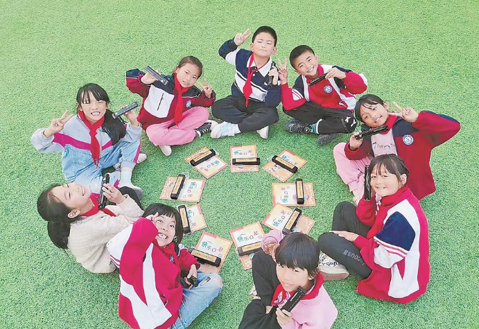 孩子围坐分享领到新口琴的喜悦。 (受访者供图)
