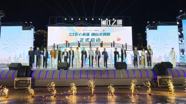 启动仪式现场。 东南网11月8日讯(本网记者 卢金福 文/图)逛市集、赏非遗、拍展品、做手工、看演出、品美食……今日晚上,第九届“匠心意蕴”闽台文创周活动在福州闽江之心开幕,活动汇聚了20多家台湾文创品牌和30多家福建的文创品牌。活动将持续至11月12日,每日10:00-21:00开放。 “匠心意蕴”闽台文创周活动自2016年起已连续举办八届。活动邀请了上百名闽台两地文创业者,开展闽台文创市集、文创主题沙龙、手作技艺创作、文艺展演和文创公益竞拍等丰富多彩、形式多样的活动,展示两岸精品手作商品、闽台特色文创产品、代表性非遗项目衍生品等,近距离体验非遗创作的乐趣,感受两岸多元多彩的文化艺术,为两岸文创业者搭建精品展示、技艺互动、交流互鉴的合作平台,推动两岸文旅融合发展。