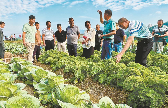 10日,由厦门市果品协会和厦门市集美区果蔬经济促进会共同发起组织的厦门农户赴三明学习考察活动举行。来自厦门市集美、同安等区的20多名果农、花农、菜农以及专业种植大户走进三明沙县,参观现代农业产业园区,深入了解当地在水稻、花卉、果蔬等领域的新品种、新技术、新突破。据介绍,这是两地之间首次由民间果蔬协会发起,农户自发参加的民间学习考察活动。图为厦门农户考察学习沙县现代蔬菜产业。