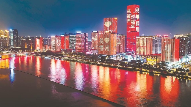 21日起,福州闽江北岸海峡金融商务区(上图)、五一广场、东街口等多处地标建筑推出“来福州,过福年”主题灯光秀以及在LED大屏滚动播放新春海报,充满浓浓年味。