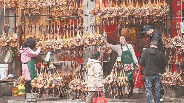 春节前,建瓯市管葡路上主打传统风味的板鸭店吸引众多顾客前来采购,生意十分红火。建瓯板鸭是南平市级非遗项目、福建传统名优土特产品,素有“八闽佳肴”之美称,深受消费者喜爱。被授权“建字号”品牌后,建瓯板鸭更是如虎添翼,年销售量已突破300万只,成为当地的一张亮丽名片,也是当地年夜饭的必备菜品。福建日报通讯员 魏永青 摄 |