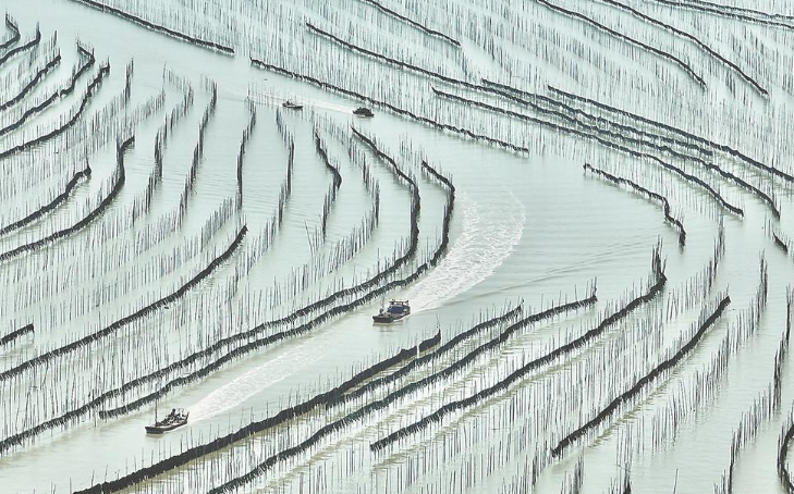 近日,“中国海带之乡”霞浦县35万亩海带迎来采收季节。在霞浦县沙江镇,养殖户利用晴好天气和潮汐便利,昼夜抢收抢晒海带,海上岸边一派繁忙丰收景象。2024年,霞浦全县鲜海带总产量160多万吨,总产值约35亿元,海带相关产业就业人员达5万余人,成为带动当地群众增收、促进乡村振兴的重要支柱产业。图为霞浦县沙江镇海域船来船往转运海带。
