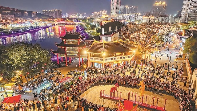 5月2日,福清市利桥历史文化街区,游客在观看舞狮表演。近年来,福清市通过打造历史文化街区,培育旅游购物、美食餐饮、非遗演出、游船赏夜等旅游消费新业态,不断激发“夜经济”活力,有力促进旅游经济发展。谢贵明 摄