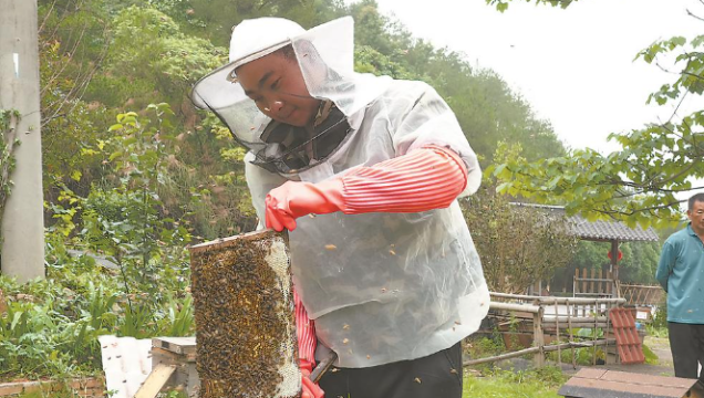 入夏以来,武平县万安镇石燎阁林下养蜂基地内,成群的蜜蜂在山林间嗡嗡飞舞,穿梭于繁花绿叶间采蜜。 蜂农身着防护服,轻手轻脚地掀开蜂箱盖,提起蜂巢板,仔细查看晶莹剔透的蜂蜜(如图)。抖蜂、割蜂蜡、摇蜜……一系列动作娴熟而有序,丰收的喜悦洋溢在每个人脸上。 “今年气候适宜,蜜蜂采蜜期长,产量、品质都比去年好。”万安镇蜂农王春晖介绍,今年他共养殖蜜蜂15箱,每到蜜蜂采蜜期就会把蜜蜂拿到石燎阁,每箱蜜蜂平均可产蜜10公斤,今年总产量预计可达150公斤。按照如今的市场价格,可增收1万多元,对比去年因持续降雨导致的“几乎绝收”情况,今年可谓是个丰收年。 “我们养殖的是适应性强的本土中华蜜蜂。”石燎阁蜂业有限公司总经理钟晚生高兴地介绍,“基地依托万安优越的生态环境和无污染的山林资源,加上当前百花盛开的丰富蜜源,所以产出的蜂蜜品质上乘,深受市场青睐,许多客户都是提前预订。” 基地所处的万安镇山林植被茂盛,蜜源植物种类繁多,为蜜蜂提供了绝佳的生存繁衍环境和优质“食材”。中华蜜蜂在采集百花酿造独特“百花蜜”的同时,也为山区植物授粉,成为维护当地生物多样性和生态平衡的重要“使者”。这种“绿水青山就是金山银山”的生动实践,让林下养蜂成为万安镇农户增收致富的绿色高效途径。 为做强林下“甜蜜事业”,钟晚生不断开发蜂蜜延伸产品,延长产业链。蜂蜜酒、蜂蜜绿茶、蜂蜜护肤品等十几种创新衍生产品广受市场欢迎。同时,他积极借助电商、直播、认养等模式拓宽销售渠道,推动武平生态蜂蜜品牌走向全国。 此外,钟晚生还精心打造蜜蜂科普基地,串联起养蜂体验、酿造观光、品鉴消费、研学旅游等环节,为游客提供全方位的“甜蜜”体验,形成“产业+文旅”融合发展模式。 近年来,万安镇通过发展蜂蜜、果蔬等特色现代农业,探索“合作社+农户+电商”模式,带动1000多户村民参与种养。目前,全镇已建成标准化蜂场42个,蜂群规模达2.3万箱,年产值占全县蜂产业的三分之一,成为乡村振兴的“甜蜜引擎”。 |
