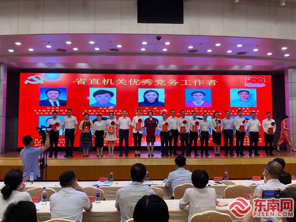表彰优秀党务工作者。东南网记者 陈楠 摄 东南网7月16日讯(本网记者 陈楠)今天上午,福建省直机关学习贯彻习近平总书记“七一”重要讲话精神宣讲报告会暨“两优一先”表彰大会在福州召开。 会上,省直机关工委授予197名同志“省直机关优秀共产党员”、授予198名同志“省直机关优秀党务工作者”、授予福建省人大常委会办公厅秘书处支部等197个基层党组织“省直机关先进基层党组织”称号。