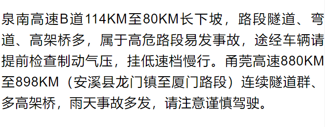 莆田高速 秀永高速莆田西出口往市区方向交叉口红绿灯处易拥堵,可能造成匝道阻滞情况,请驾驶人提前规划,错峰出行。沈海高速A道2165KM至2166KM西埔枢纽互通车流量大,路况复杂,请提前熟悉路况,严禁超速行驶。 三明高速 福银高速尤溪、泰宁段,泉南高速清流、宁化段,浦武高速泰宁、建宁等路段,易出现霜冻、结冰、大雾等天气,请驾驶人尽量避开夜间、凌晨等时段出行。隧道路段,路况复杂,请注意观察路面提示牌,控制车速,谨慎驾驶。 南平高速 长深高速吉祥隧道至跃村枢纽段车流量大,其中,吉祥隧道为超过2公里的长上坡隧道,易发追尾事故。京台高速建瓯至徐敦路段车流量大,冬季夜间、凌晨时段易起雾,严防追尾事故。浦武高速鹰山隧道路段,若发生交通事故或拥堵,建议前往光泽、江西方向的车辆,从S31浦武高速下沙收费站绕行G322国道,到邵武收费站后,上高速从S10宁光高速行驶至光泽、江西。 龙岩高速 厦蓉高速新泉至豪岭隧道、龙岩西至京源口隧道或龙岩、龙岩西收费站拥堵时,请驾驶人保持安全车距,有序通行。假期期间,建议从龙岩东肖站(至高动漫城往后田3公里)上高速,可避开大车流,畅通出行。 宁德高速 京台高速排头枢纽至岗上隧道路段(A道1817KM+700M至1825KM)为车流汇流点,易发生刮擦追尾事故。请途经驾驶人减速慢行,保持安全车距。该路段若发生严重拥堵,往福州方向车辆可从福银高速绕行。 祝大家 元旦快乐、一路顺风! |