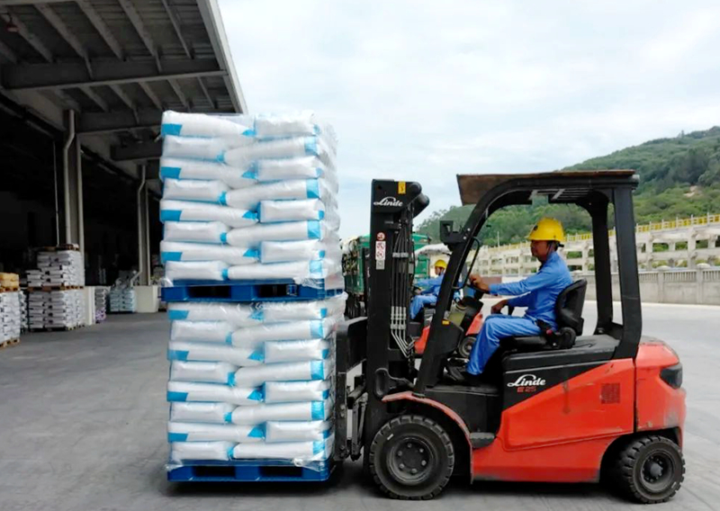 以防物资被淋湿,福化鲁华公司正在紧锣密鼓地对现场产品进行转移。(林群章摄)