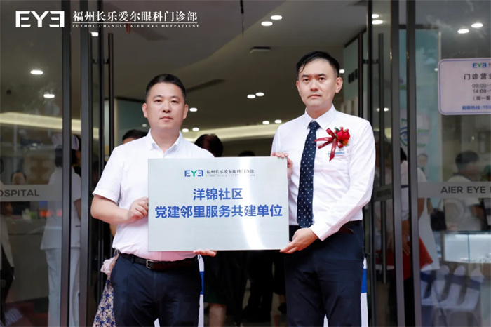 党建引领邻里共建 提升居民眼健康水平 爱尔眼科发展的过程,就是党建引领的过程。二十多年来,爱尔眼科充分依托医疗资源优势,把慈善、公益、扶贫等项目作为党建工作的切入点,将党和政府对人民群众的关怀通过党建工作得到充分体现。长乐爱尔紧跟集团步伐,坚定不移地走“党建引领眼健康”的正确发展道路。 开业庆典上,长乐区吴航街道洋锦社区与长乐爱尔签订党建共建协议,长乐区吴航街道洋锦社区党委书记王斌为长乐爱尔授予“洋锦社区党建邻里服务共建单位”牌匾。今后,爱尔眼科将正式在长乐区持续开展“幸福社区、爱满邻里”居民眼健康关爱活动,切实提升居民的眼健康水平,增强邻里之间的和谐与互助,共同绘制一幅幅健康、幸福、和谐的社区新画卷。