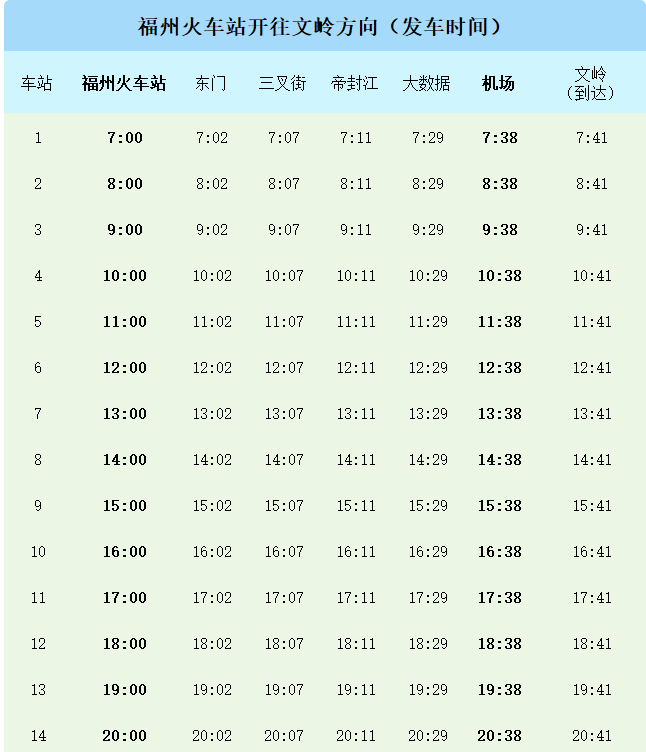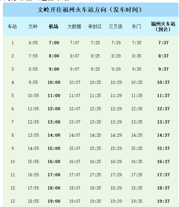第一列车为直达快车,发车时间为6:00,该列车由福州火车站始发,经停机场站,终到文岭站,其余中间站点均不停靠。