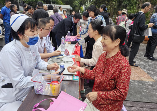 活动现场,天竞拓思幼儿园的孩子们以手势舞《孝心到永远》拉开帷幕,稚嫩的动作传递着纯真孝心;屏东文艺队带来了《思念陪着鸿雁飞》《我们的祖国歌甜花香》等精彩演唱,退役军人李铮的独唱《遍插茱萸少一人》更是引发全场对重阳文化的共鸣,最后以小合唱《夕阳红》为文艺环节画上圆满句号,悠扬歌声中满是对老年生活的美好祝愿。 值得一提的是,此次活动特意摆设了5大圆桌,邀请50位80岁以上的高龄老人围桌而坐现场欣赏文艺盛宴的同时为每位老人送上精心准备的安康礼品。八段锦跟操环节,老人们跟随博医汇指导老师舒展筋骨,感受传统养生功法的魅力;由晶特尔齿科提供的中医口腔知识有奖问答则让老人们在答题过程中收获健康知识;听歌猜歌名、传花快答等游戏,更是让现场笑声不断,老人们在欢乐互动中拉近了彼此距离。