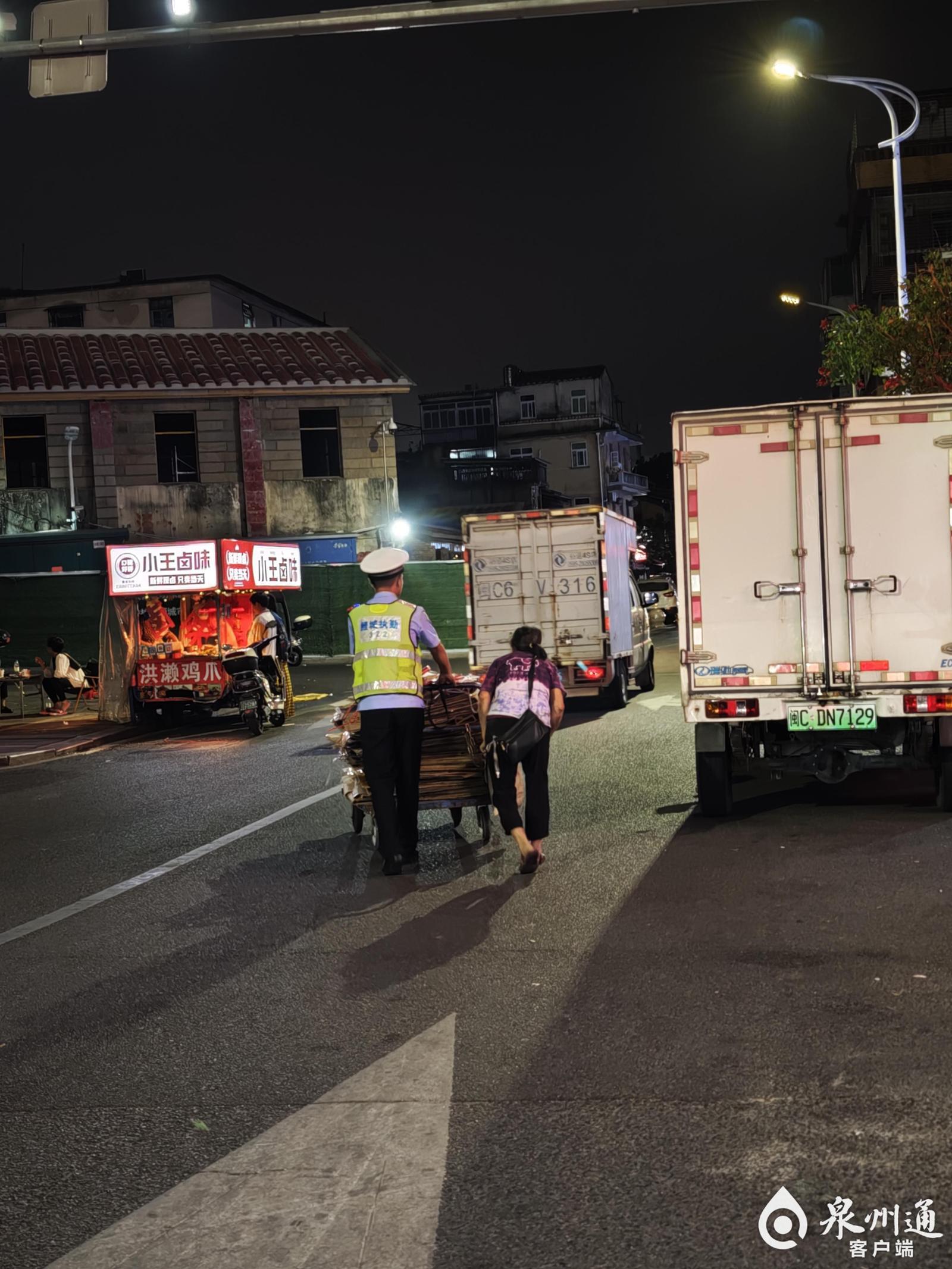 泉州深夜街头暖心一幕:他一手推车,一手扶老人
