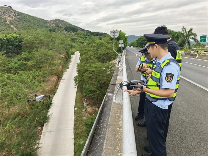大队与辖区养护站成立联合巡查组,对沿线毗邻村庄、互通枢纽等关键路段的排水沟、防护栏、隔离栅等交通安全设施进行拉网式排查。为克服高边坡、桥下空间等区域巡检难题,联合巡查组采用“徒步巡查+无人机巡航”的立体化排查模式,实现对隐蔽角落的快速、精准检查与影像取证,确保排查工作无死角、全覆盖。