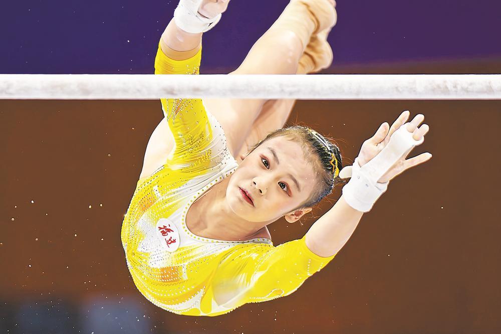 16日,邱祺缘在高低杠决赛中完成高难度的跃杠动作。