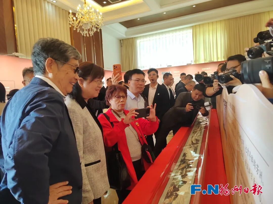 15日,“信仰无声,山河同证”特展现场。吴红与何遂之孙何迪为《长江万里图》复制卷特展剪彩。这幅66.4米长卷由何遂亲绘,吴石题诗4首,是祖辈革命情谊的见证。