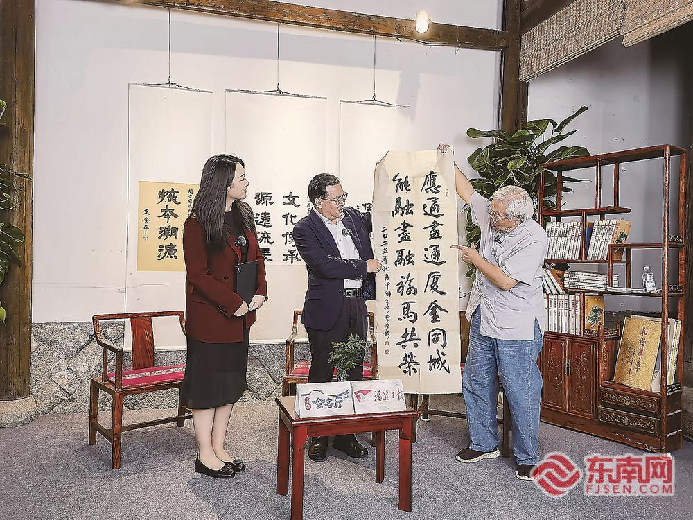 曹原彰(右)挥毫泼墨,用书法表达“同城生活圈”给金马乡亲带来的利好。福建日报记者 刘深魁 摄