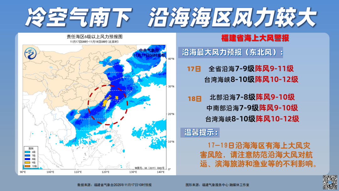 17日,东北风,全省沿海最大风力达7-9级阵风9-11级,台湾海峡最大风力达8-10级阵风10-12级。