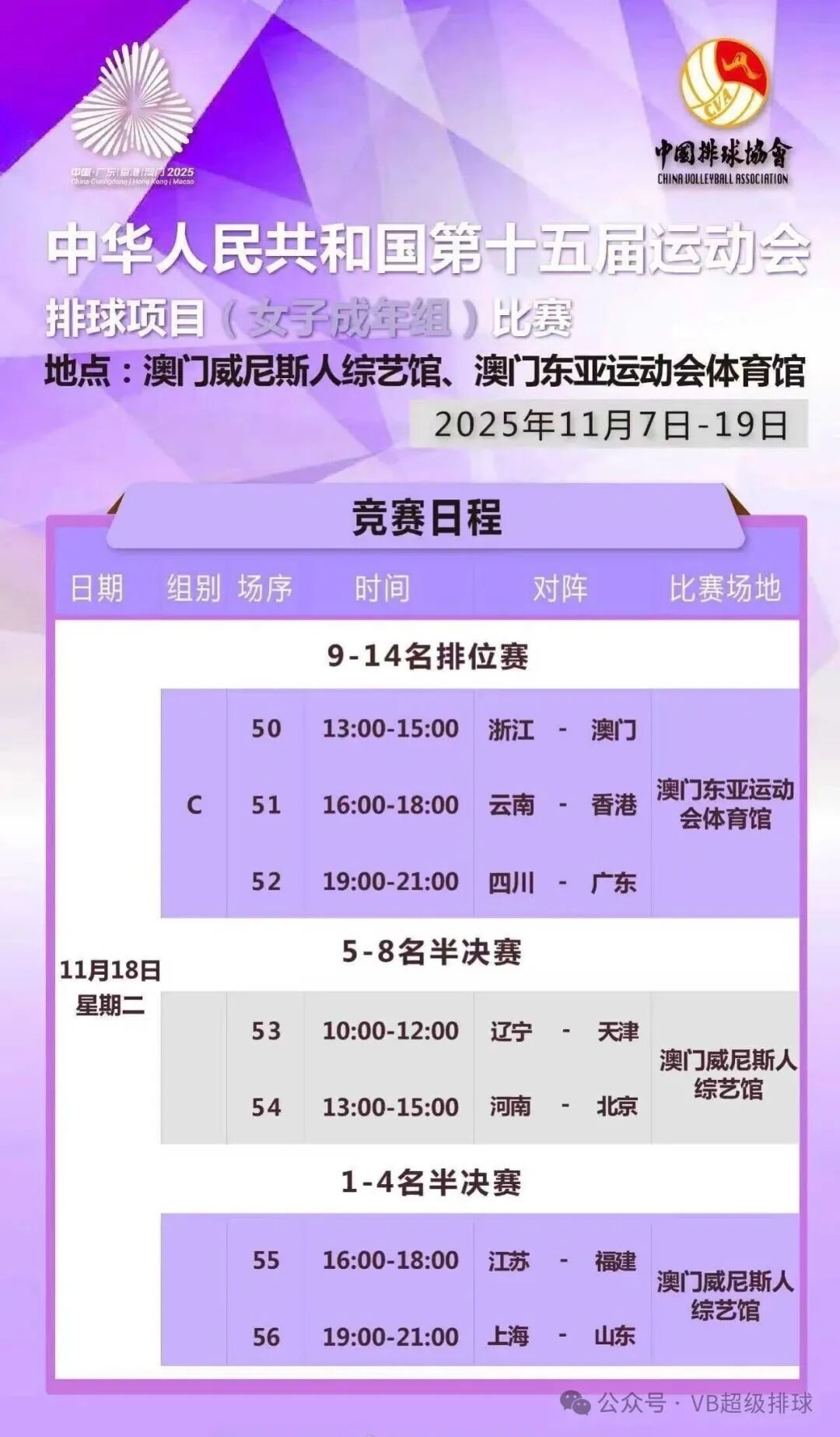 当日,在澳门进行的第十五届全国运动会排球女子成年组四分之一交叉赛中,福建队3比1战胜天津队。