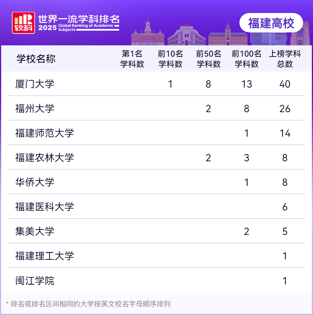 福建在2025软科世界一流学科排名中,共有9所高校的109个学科上榜。其中,1个学科跻身全球Top10,12个学科跻身全球Top50,28个学科跻身全球Top100。