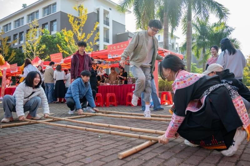 现场体验畲族竹竿舞,沉浸式体验少数民族风情。陈子瑶(摄)