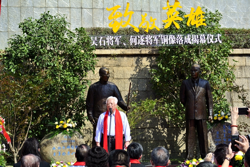 何遂四子何达讲述父亲故事,身后就是落成的铜像吴石(右)和何遂。东南网记者 林先昌 摄