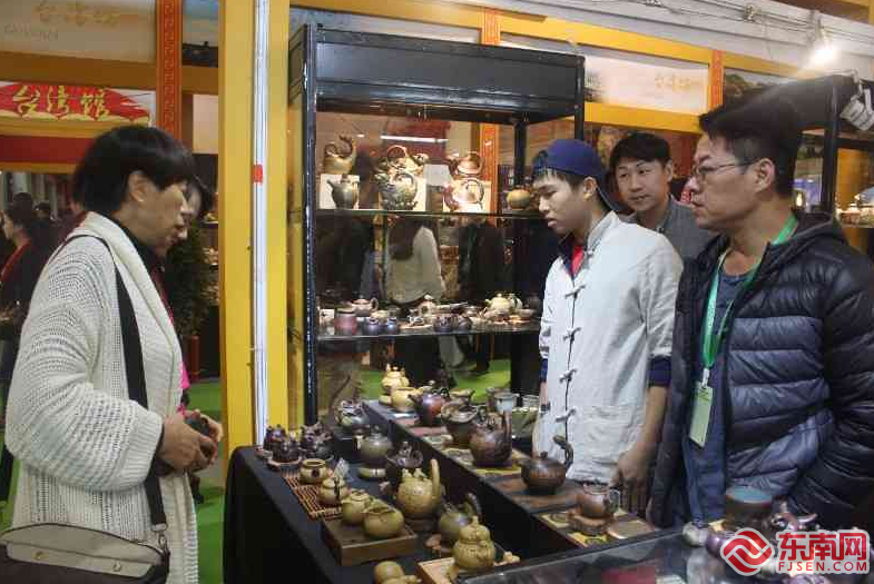 历届茶博会,台湾馆无疑是最吸引人眼球的展馆之一。在第十三届海峡两岸茶业博览会上,台湾馆企业数和展位数均创新高。据了解,今年110家台湾企业参展,较去年增加25家,展位127个,较去年增加35个。图为台湾陶艺师麦智通带来造型独特的茶器茶具 东南网记者 张立庆 摄