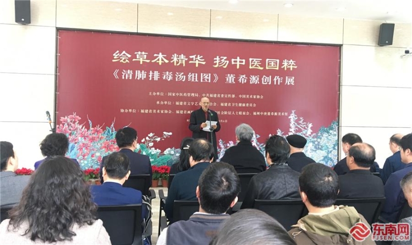 “绘草本精华•扬中医国粹——《清肺排毒汤组画》董希源创作展”福州站现场,董希源介绍创作历程。(东南网记者 蔡丽洁 摄) 东南网3月2日讯(本网记者 蔡丽洁)日前,“绘草本精华·扬中医国粹——《清肺排毒汤组画》董希源创作展”在福建省画院开展。 清肺排毒汤由中医古籍《伤寒杂病论》的多个经典方剂融合创新而成,被纳入国家第六版至第八版新冠肺炎诊疗方案。作品《清肺排毒汤组画》由全国政协委员、画家董希源创作,这些在抗击新冠肺炎疫情中发挥重要作用的中医药方剂,首次成系列被画家搬上画卷。 开幕式现场,福建省政协原主席游德馨,省政协副主席、民盟福建省委主委阮诗玮,省委宣传部常务副部长许守尧,省政协文化文史和学习委员会主任、省委组织部副部长、省委老干局局长何国辉,省委统战部副部长李文慎等领导出席,省政协文化文史和学习委员会办公室、省委宣传部文艺处、省中医药管理局、省美协、省画院、省新阶联等有关部门负责同志与艺术界、中医药界和各界人士、新闻媒体朋友百余人共同参与。开幕式由福建省文联书记处书记、副主席、省美协主席王来文主持。 福建省文联党组书记、书记处书记、副主席王秋梅在开幕式上致辞,她表示,董希源先生始终关心国家,热心服务人民。这场画展既为我们展现了中医药和中国画这两大国粹的圆通与融合,也充分展示了我省艺术家的家国情怀和强烈的社会责任感。希望通过该展览的举办,引导更多文艺工作者传承弘扬中华优秀传统文化,创新创造,潜心创作,到人民中去,为时代画像,为时代立传,为时代明德,以文艺精品庆祝中国共产党成立100周年。 董希源从小就对中医药怀有敬畏之心,多年来也始终推崇中医药文化。去年2月4日,新冠疫情暴发不久,董希源就在全国政协委员履职平台提交建议,呼吁尽早出台中医药防治方案。“清肺排毒汤”问世,并在抗疫中发挥重要作用,令董希源非常自豪。 “中医养人,国画养心。”董希源深知,作为画家,最应做的事,就是用手中的画笔,创作鼓舞士气,振奋人心,传播正能量的作品,为中医药造像,讲好中医药抗击疫情的中国故事。董希源当即动笔,以抗疫利器“清肺排毒汤”为创作题材,采用兼工带写的表现手法,历经5个月创作完成该剂药方中的21味中草药的原生态与成药态42幅作品。去年9月,“清肺排毒汤”画作亮相北京中国政协文史馆,得到社会各界人士认可与积极肯定。 董希源表示,《清肺排毒汤组画》的创作与展览不仅是为了艺术,更希望能为中医药在全社会的普及,以及传承创新发展,为中医药文化传播行动做出一个画家力所能及的贡献。董希源呼吁广大艺术工作者参与宣传中医药文化、传播中医药文化,用艺术助推中华民族瑰宝中医药的传承精华,守正创新,增强文化自知,文化自觉与文化自信。 此次展览由国家中医药管理局、中共福建省委宣传部、中国美术家协会联合主办,福建省文联与福建省卫生健康委员会承办,是继去年9月北京首展后的第二站展览,将持续到3月6日。下月该展览将应邀在上海展出,并继续在全国巡展。