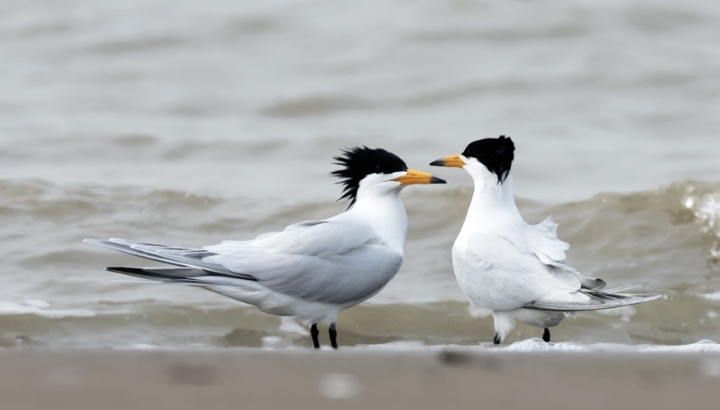 中华凤头燕鸥。 涨潮之时 惊现“神鸟” 当天12点40分,海水高潮,调查员们沿海岸线观测,发现了两只大凤头燕鸥。以往的观鸟经验告诉他们,被称为“神话之鸟”的中华凤头燕鸥喜欢和大凤头燕鸥混群生活,二者最显著的区别就是中华凤头燕鸥的嘴尖是黑色的。 黄学鼎介绍,在闽江河口湿地,全年最早记录到中华凤头燕鸥的日期是2016年的4月1日。 当天下午1点50分,卢国成和肖炳祥正猫着腰跪在地上准备继续拍摄大凤头燕鸥,突然有两只燕鸥“嘎嘎嘎”叫着从他俩头顶飞过,降落在附近的水边。 “镜头对过去,这一看不得了,它们的嘴端是黑的!立马快门声不断,哒哒哒,哒哒哒……”卢国成说。 镜头里,两只中华凤头燕鸥共浴爱河,在水边洗澡、嬉闹,雄鸟绕着雌鸟转圈圈,双方跳着爱的华尔兹。 黄学鼎告诉记者,这两只刚刚光临闽江河口湿地的中华凤头燕鸥“头发非常漂亮,就像18岁的姑娘披着乌黑的长发”。因为刚开始谈恋爱,它们打扮得特别漂亮。而到5月份,经过交配、产卵,它们头顶上的黑色羽毛会如人类衰老般迅速发白。到9月份时,则会满头斑白。