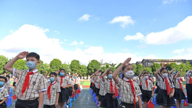 8月30日,学生在广西南宁市滨湖路小学升旗仪式上敬礼。当日,广西南宁市各中小学在严格落实疫情常态化防控基础上正式开学。 新华社记者 周华 摄