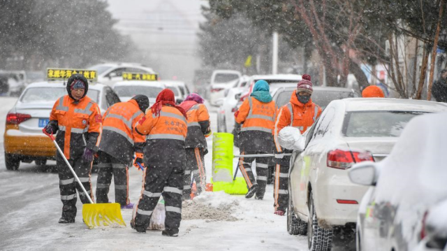 11月22日,环卫工人在长春市朝阳区东中华路清理积雪。当日,吉林省长春市迎来新一轮降雪天气,长春市城市管理局组织一万余名环卫工人与一千余台清雪机械设备,进行循环清雪作业,保障市民出行安全。 新华社记者 张楠 摄