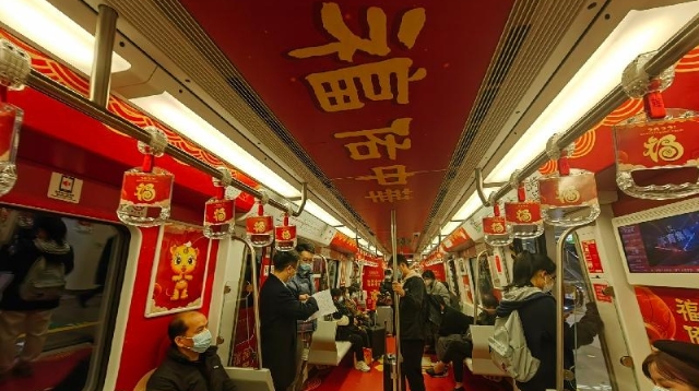 福州地铁开出“福”文化主题列车。东南网记者 冯川叶 摄 东南网1月26日讯(本网记者 冯川叶)今日上午,福州地铁在1号线开行了一列“福”文化主题列车。满载着“福”文化的主题列车寄托了人们对“有福之州”幸福生活的向往与对美好未来的祝愿,并把“福运”传达给每一位市民乘客。 “出门遇'福',我们一天都会带着好运气。”在地铁三叉街站上车的吴阿姨直言太惊喜了。她说,“福文化”主题列车装点喜庆,带来了浓浓的新春氛围。 这趟编号为0123的列车,每当它缓缓驶向站台,列车车头处的“福”字仿佛在向乘客传达“福”到了。主题车厢由诸多“福”元素组成,车厢顶部印有“福星高照,福佑中华”,底部则由“福”字满地,乘客一进车厢即可“踩(采)福”;车厢拉手、车门、看板上随处可见各式各样“福虎”的图案,配上一号线的“幸福红”,整列车厢沉浸在福天福地福州行的喜庆氛围中。 记者了解到,这趟“福”文化列车每天开行17趟次。春节期间,它将穿梭在福州城,为市民带来“福”气。除了主题列车外,福州地铁还通过1、2号线车站、车厢共计3673面PIS屏,在客流密集的东街口、南门兜、宁化等站点的13面LED、LCD屏每天高频率播放“福”文化宣传内容,在1、2号线共计90个安检口以及站台层屏蔽门也粘贴上了“福”文化宣传海报。