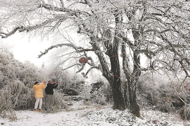 20日,位于闽赣边界、海拔1148.9米的宁化东华山白雪皑皑,不少游客前来登高赏雪。图为游客与堆起的雪人合影。赖全平 张标淮 摄