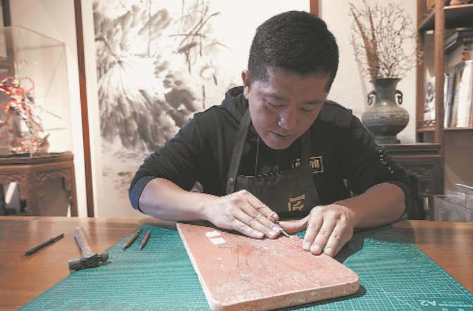 伍建东从小喜欢手工,特别痴迷闽南老物件、老手艺,老红砖的质感和特性为他的砖雕创作带来了广阔空间。 东南网12月16日讯(福建日报记者 王毅 通讯员 黄瑜鹏 陈鑫炜 文\图)提起“传统工艺”,很多人的脑海里会浮现白发苍苍的老工匠和年代久远的老作坊。其实,如今越来越多的传统工艺开始随着时代与审美的变迁而进行样式和材料工艺的创新,年轻的手工艺人则成为这一波技艺振兴的主力军。 今年六月底,文化和旅游部、教育部、科技部等十部门联合印发《关于推动传统工艺高质量传承发展的通知》,其主要原则包括“坚持守正创新,正确把握保护与利用、传统与创新的关系,激发广大手工艺者的创新创造活力,找到传统文化和现代生活的连接点,推动传统工艺的传承发展、长久保护和永续利用”。 在泉州南安,就有一群继承传统工艺并不断创新发展的年轻工匠群体。他们借助“泉州:宋元中国的世界海洋商贸中心”申遗成功,进一步提炼本土传统元素,依托古城的文化推广进行创作。 石井镇,四十出头的伍建东痴迷于古建筑红砖雕刻。“无雕不成屋,有刻斯为贵”,作为红砖古建筑重要的装饰,砖雕是国家级非物质文化遗产“闽南传统民居营造技艺”中的重要组成部分。伍建东辗转闽南各地,上门向雕刻老师傅请教,在掌握砖雕技法的同时,慢慢摸索出自己的风格。随着社会发展,传统用于装饰红砖古厝的闽南砖雕渐渐淡出,但伍建东打算用另一种方式留住这门技艺——与现代生活相结合。闽南人爱茶,伍建东就在茶文化上找突破,开发出茶盘、壶承、香插等一系列砖雕茶饰。他利用巧雕在老红砖上留好出水口,纹案图形都依照砖块釉面上的剥落痕迹进行设计。他的砖雕茶饰获得南安市十佳特色伴手礼称号。“这些简单的设计产品像一扇窗,让人们知道墙上的砖雕一样能融入生活之中,可以触摸。” 家庭是技艺最好的传习所。苏华荣出身于木雕世家,从小在家中的传统木偶传习中心学习,跟着父亲——泉州市工艺美术大师苏清良制作木偶。方寸之间雕刻百态,木偶头眉眼传神、栩栩如生。与父辈们专注传统木偶造型不同,苏华荣开始对传统人物形象进行提升改造,甚至在原版木偶形象上增添口、眼、舌、面颊等活动部件,使之呈现出更多的神态表达。“我们这一代人应该主动冲破局限、不断试验。”苏华荣表示。他有十多项作品在全国、省、市等各类比赛中获奖,其木偶作品《电音三太子》入选“中华非物质文化遗产传承人薪传奖”。 同样因为家庭传承而从事锡雕的王晓鹏,也是受父母影响从小学习传统技艺,三十出头就已经获得“泉州市工艺美术大师”称号,多件作品被中国闽台缘博物馆永久收藏。在继承传统之余,他通过实地考察和素材取样,深入了解各地的风俗民情,在作品上加入当下有创意的时尚元素,开发适于珍藏的现代艺术珍品。空闲时,他常常在收藏室里打造电影人物锡雕作品。创新的东西需要一个接纳的过程,他觉得兴趣和市场的结合需要多多尝试。 青年人的参与让传统的技艺出现转机和活力,他们用新的技术创造出新的造型和功能,也开启了传统工艺更为广泛的适用性。近年来,南安市通过与高校举办联合教学研修班、工艺美术授课进校园等方式,促进传统工艺的提升和社会认知。组织工艺美术类企业和个人参与全国和省级的竞赛,激励从业人员的创作热情,逐渐形成了不同级别梯队相支撑的传统工艺人才队伍,在百花齐放的过程中增强了我们的文化底蕴。