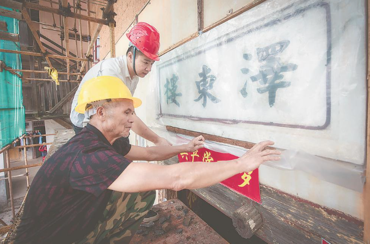 为保护好早年的灰雕工艺,李园军配合施工人员,将“泽东楼”和上下联“泽水长流革命宅”“东风争放和平花”等字样用薄膜覆盖严实。 近日,李园军和往常一样来到上寨泽东楼修缮工地了解施工进展。 作为福建省能化集团驻龙岩永定区抚市镇五湖村第一书记,李园军深知泽东楼的历史文物价值和发展红色旅游、乡村旅游的经济价值。 泽东楼地处永定抚市、湖雷、陈东三乡镇交界的五湖村上寨革命基点村,原为张家屋,主楼为三层四方土楼。1929年8月上旬毛泽东化名为“杨先生”,偕妻子贺子珍等一行,拖着疟疾之身,住进了这里。后来,小土楼成为苏维埃、游击队开展革命斗争的指挥部,1936年被国民党放火烧毁。1951年,永定县政府按原貌重建这栋土楼,命名为“泽东楼”,并题联“泽水长流革命宅,东风争放和平花”。 如今的泽东楼,掩映在闽西大山深处的一片青青翠竹之中。虽然它很不起眼,却是全国唯一以毛泽东名字命名的土楼,成了吸引八方游客的红色旅游胜地。 李园军于2021年7月驻村后,带领乡亲们积极投工投劳、集资聚力,着手开发泽东楼景区。 如今,一条8公里的水泥大道从山下直通泽东楼。红军胜利亭、望红台、爱国主义教育培训中心、红色书香研学基地相继建起。在泽东楼开始修缮的同时,邀请歌唱家录制一曲《泽东楼上一盏灯》音乐视频。 当年,毛泽东在土楼里边养病边指导当地的革命活动,他坚定信念,斗志昂扬,为4个月后的《古田会议决议》和《星星之火,可以燎原》奠定了坚实的理论基础和实践依据。如今,泽东楼即将修缮完成,将推动红色之旅,引领广大村民走向乡村振兴的大道。