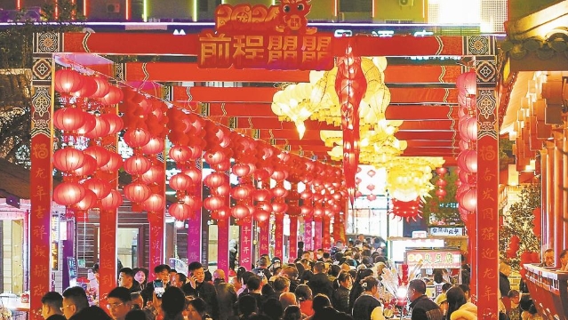 8日,连城县四角井历史文化街区流光溢彩、美不胜收,返乡过年的市民如织,穿行在60多米长的腾飞巨龙花灯之下,品尝连城客家特色美食,欣赏“龙腾连城”水幕灯光秀,喜迎龙年。