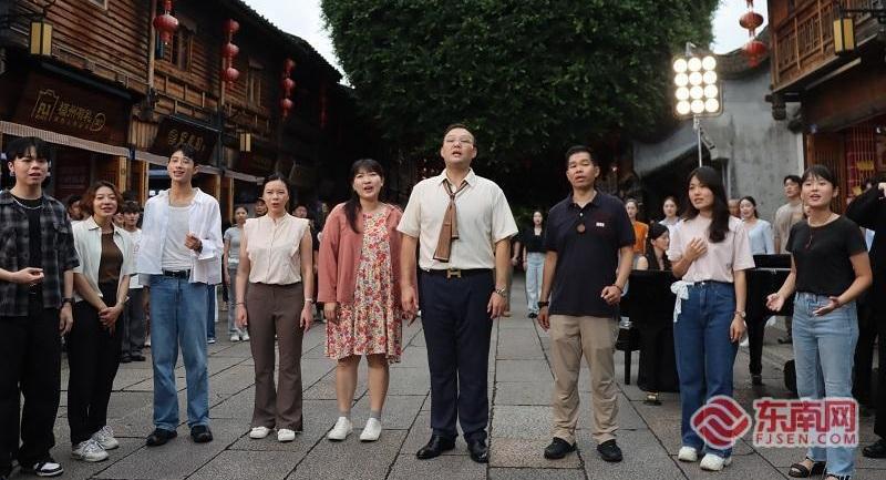 快闪活动现场。 东南网8月5日报道(本网记者 卢金福 文/图)“让我们唱这歌,分享着,这久违了的光和热,不管路上的风波曲折……”今日上午,福州三坊七巷爱心树下,深情而充满力量的歌声悠然响起,回荡在古巷间,瞬间抓住了往来游客的脚步,大家纷纷循声聚拢,驻足聆听。这是第十三届海峡青年荟·“烽火同声——纪念抗战胜利暨台湾光复80周年两岸青年合唱快闪活动”的动人一幕,40余位来自海峡两岸的音乐青年并肩而立,用歌声共同铭记历史,传递深情。 在福州活动期间,两岸青年分别在福州三坊七巷、马尾船政文化园区、闽江等地共同唱响《长城谣》《毕业歌》《归来》等镌刻着民族记忆的经典歌曲,用展现新时代精神风貌的动人旋律,通过“历史场景+青春歌声”的碰撞,凸显“记忆传承”主题。