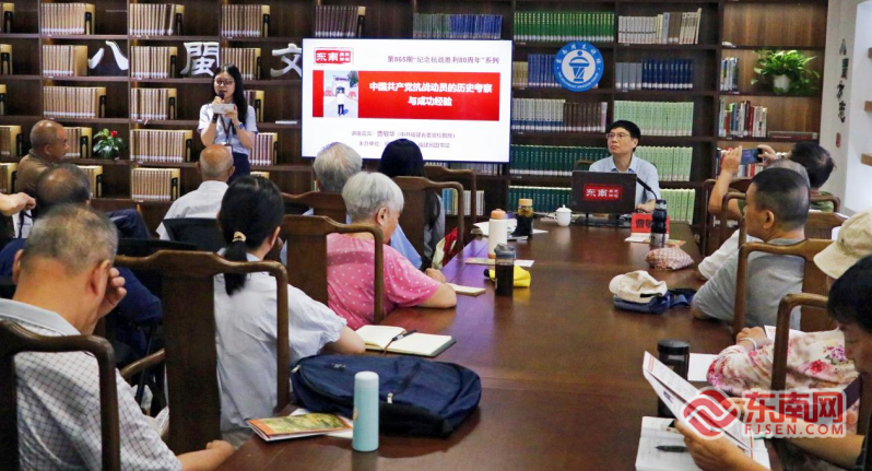 “中国共产党抗战动员的历史考察与成功经验”讲座现场 东南网8月26日讯(本网记者 郑琦 文/图)十四载抗日战争能够取得最终胜利,离不开全国各党派、海内外同胞团结御侮、共赴国难。值此中国人民抗日战争暨世界反法西斯战争胜利80周年之际,由福建省社科联、福建省图书馆联合主办的“东南周末讲坛”推出“纪念抗战胜利80周年”系列讲座。8月23日上午,该系列首场讲座在省图书馆“八闽书房”正式开讲。中共福建省委党校教授曹敏华以“中国共产党抗战动员的历史考察与成功经验”为题,带领读者回望全民族抗战的光辉历程,聚焦抗日战争时期中国共产党领导的动员工作,深入总结其中蕴藏的宝贵历史经验,阐释中国共产党在全民族抗战中发挥的中流砥柱作用。 古今中外,凡有战争,都离不开动员。讲座伊始,曹敏华追溯“战争动员”词源,从军事学角度厘清概念,简要介绍了战争动员学的理论体系以及近代日本总体战体制的形成。随后,他聚焦中国共产党抗战动员思想的形成和发展,结合大量史料文献,以时间为线索,将局部抗战到全面抗战时期中国共产党战争动员思想的形成、发展以及广泛开展抗战动员的实践向读者娓娓道来:《中共满洲省委为日本帝国主义武装占领满洲宣言》《中华苏维埃共和国临时中央政府宣布对日战争宣言》等多份决议、宣言证明,九一八事变后,中国共产党率先举起抗日旗帜,发出团结抗战的呼声;华北事变后,中国共产党起草发表《为抗日救国告全体同胞书》,呼吁停止内战,促成西安事变和平解决,无不彰显着党对抗日救国念兹在兹的崇高风范;全面抗战时期,中国共产党始终奔走在战争动员的第一线,以报刊、广播、画册等传播渠道为载体,从政治、经济、文化、军事武装、科学技术等多方面坚持不懈地深入动员、发动民众,凝聚起中华民族抗击日本侵略的坚强决心和民族伟力。