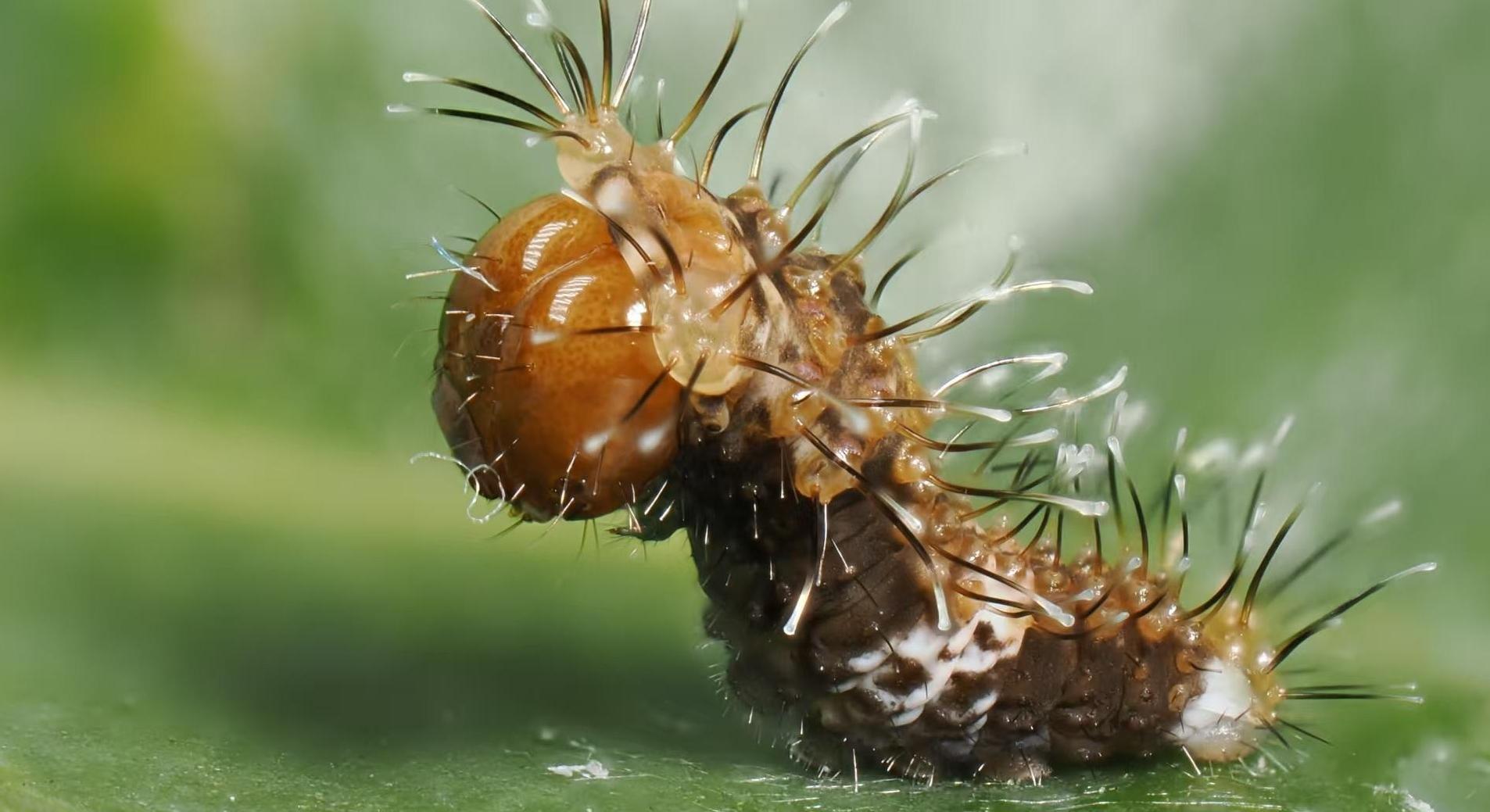 金斑喙凤蝶卵粒 微距镜头下,深山含笑叶片上,金斑喙凤蝶卵粒毫发毕现:发育至后期时,卵壳呈半透明,透光可见发育良好的幼虫时而静止、时而蠕动,隐约可见其深黑色的头部。随后,它以大颚咬开卵壳,破壳而出,一口一口将卵壳啃食殆尽——这是幼虫孵化后的第一餐。