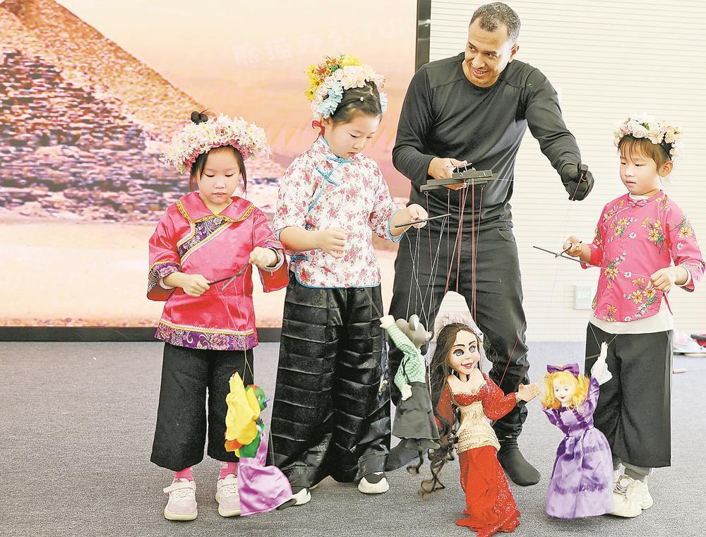 图为16日,埃及埃尔马鲁萨剧团的艺术家与泉州市温陵实验幼儿园的小朋友共同表演提线木偶。