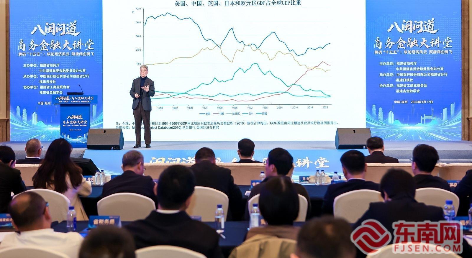 大讲堂现场。 东南网3月17日讯(本网记者 卢金福 文/图)今日,由福建省商务厅、中共福建省委金融委员会办公室主办,中国银行福建省分行、福建日报社承办,福建省工商业联合会、福建省金融学会协办的“八闽问道”商务金融大讲堂在福州举办。 本次大讲堂以“解码‘十五五’:纵论经济风云,赋能闽企腾飞”为主题,汇聚了来自政府部门、金融机构、外资外贸企业及研究机构的各界代表,深入研判全球经济发展趋势,共商百年未有之大变局下福建建设开放强省的新机遇、新路径。 活动特邀中国国际经济交流中心资深专家委员朱民教授作《2026世界经济金融:逆全球化下的中国经济新全球化》主旨演讲。