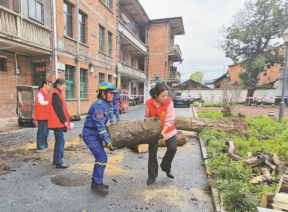 24日一早,邵武市水北街道原医药站宿舍小区传来“轰”的一声巨响,院内一棵高约20米的枯树突然倒下,所幸未造成人员伤亡,但倒下的枯树堵住了楼道,人员无法通行。社区工作人员迅速联系了有移除居民区“危树”经验的邵武市蓝天救援中心。