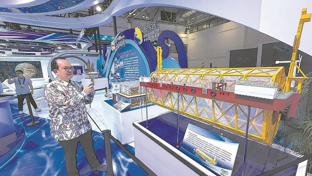 观众在拍摄“乾动2号”深远海养殖平台的模型