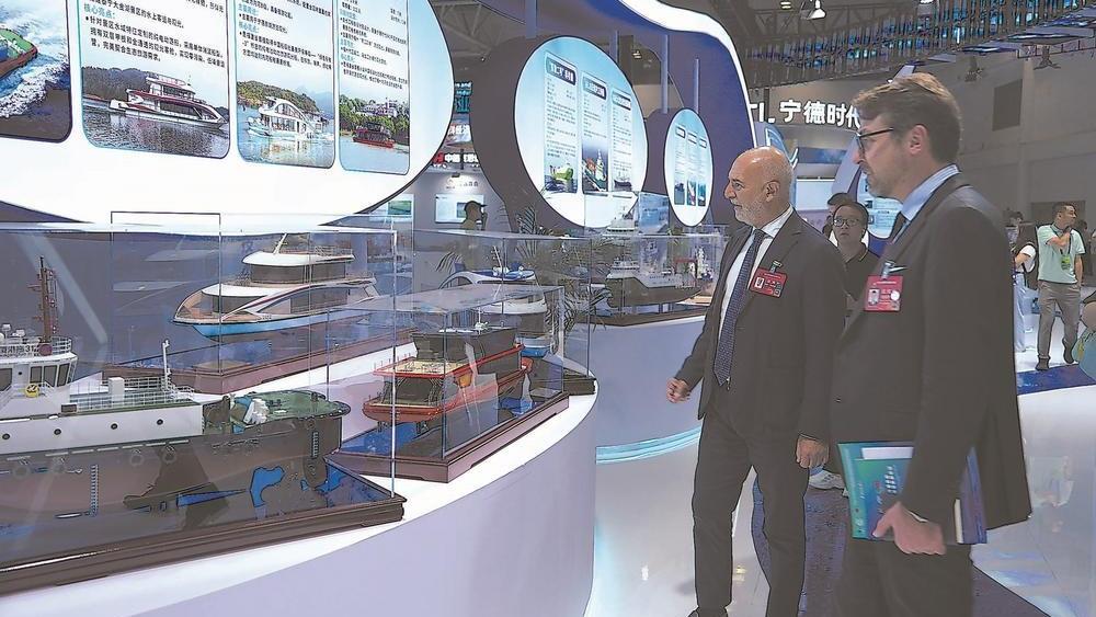 福建馆里的电动客船吸引了外国嘉宾的驻足与关注